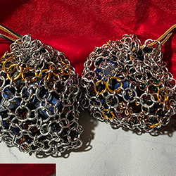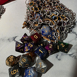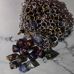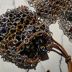 All our dice bags, boxes, and containers are hand made. Some are printed on 3d printers (our own design or licensed commerically), but all leather, cloth, and chainmail are hand stitched.